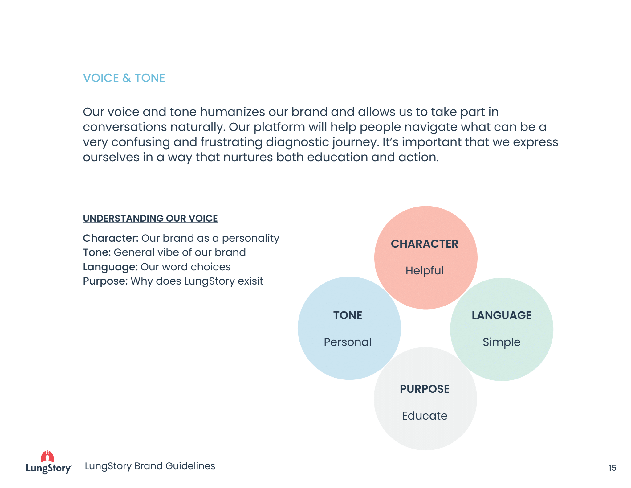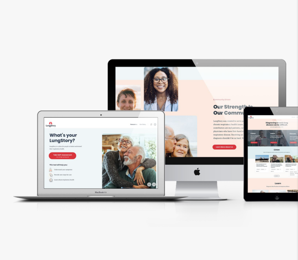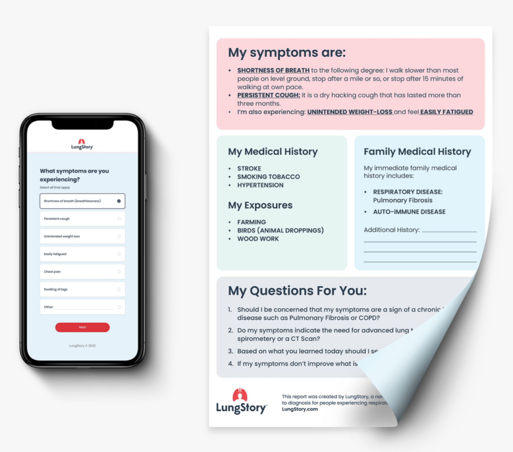 To ensure that we were creating more than just a symptom survey tool we set out to design a destination for diagnostic support. This destination needed a feeling of trust and approachability that would invite users to feel comfortable sharing their information and offer resources they would find valuable. What we needed to build was a brand for respiratory health. The brand we built around our product was LungStory. This direct-to-consumer approach utilizes our expertise in marketing and brand positioning to create connection to users. Our brand is built around storytelling and how people find understanding and guidance through a narrative experience that reflects their own personal journey.