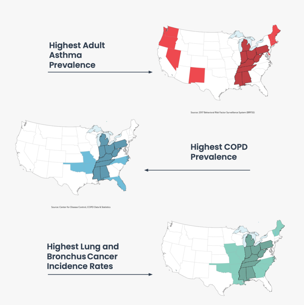 Prior to deploying LungStory we needed to better understand the market for respiratory health in America. As it turns out there was very limited information on the relationship between respiratory disease prevalence and geography. By combining national healthcare data with direct-to-consumer marketing tactics to discover potential target audiences for our diagnostic support solution our respiratory health research led us to discover the prevalence of chronic respiratory disease disproportionality affecting certain states in America.