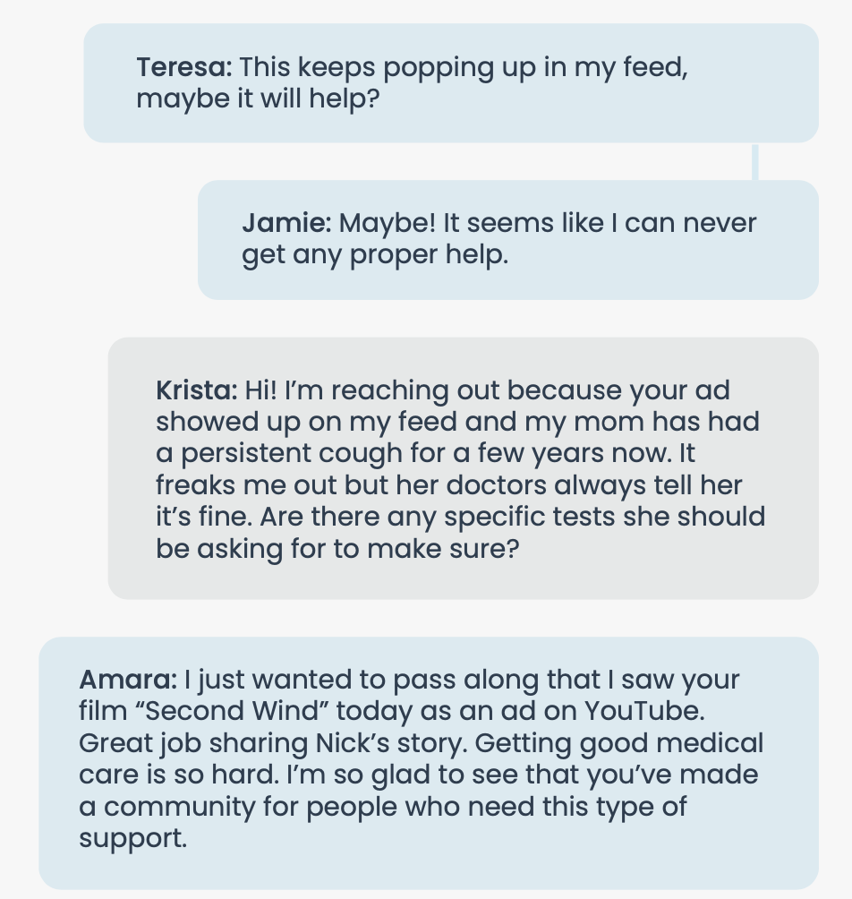 Our follow-up survey of LungStory survey participants revealed that the platform was successful in helping people receive a more timely diagnosis for their symptoms. On the right is a small selection of comments and emails we received during the release.